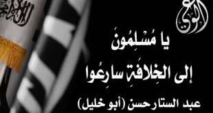 بسم الله الرحمن الرحيم يا مُسْـلِمُونَ إلى الخِلافَةِ سارِعُوا عبد الستار حسن (أبو خليل) حَمِيَ الوَطيسُ، ذَوُو النِّفاقِ تَـزَلزَلُـوا هذا الظَّــلامُ لِكُـلِّ فَجـرٍ ســــابِـقٌ لكنَّـنا صُــبُراً نُواجِـهُ حَـتـفَنا يا أُمَّــةَ الإســلامِ قُومِي وَاشـهَدِ سُــنَنُ الإلهِ فَلا يَجُــودُ بِنَصـرِهِ حَـلَـبُ الإبـاءِ مَعَ الكَـرامَةِ وَالعُـلَى فَلَيَعـلَـمَنَّ الكَـونُ أنَّ دِماءَنا لَبَّـيكِ يا رُوحَ …