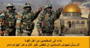 أكمل القراءة »نداء إلى المخلصين من أهل القوة ألم يَــأْنِ لجيوش المسلمين أن تنفض غبار الذل وعار الهزائم أمام كيان يهود المسخ؟! (يَٰٓأَيُّهَا ٱلَّذِينَ ءَامَنُواْ كُونُوٓاْ أَنصَارَ ٱللَّهِ)